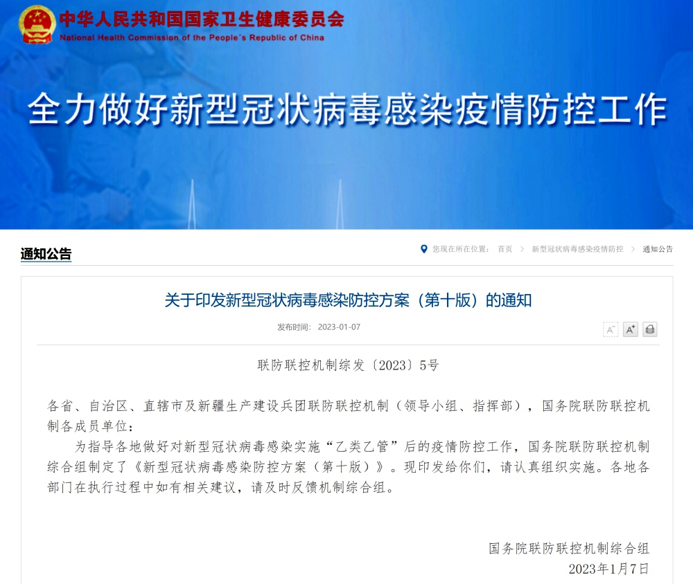 關(guān)于印發(fā)新型冠狀病毒感染防控方案(第十版)的通知