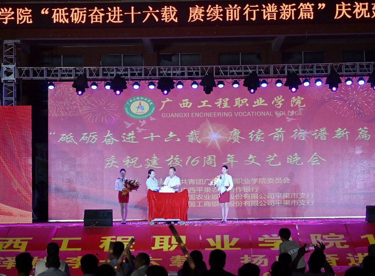 學(xué)校董事長李益宣布廣西工程職業(yè)學(xué)院慶祝建校16周年文藝晚會開始!禮炮響起,煙火綻放,校園的夜空璀璨,校園里其樂融融,共同慶祝學(xué)校16歲生日,祝愿廣西工程職業(yè)學(xué)院的未來更加輝煌!