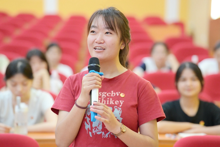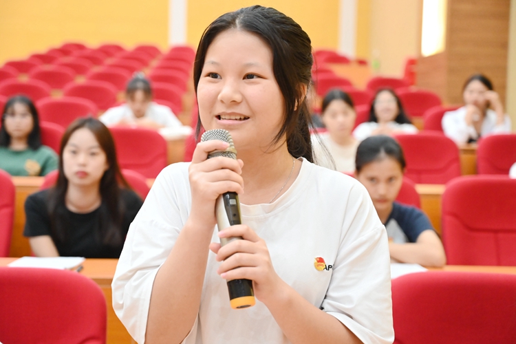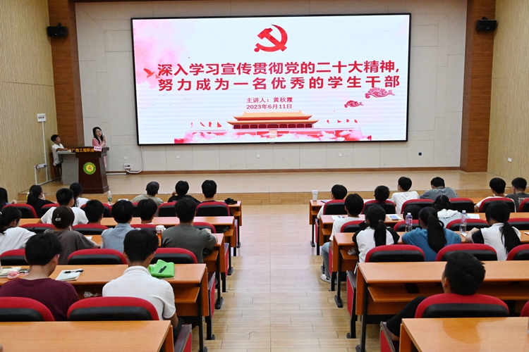 從中,同學(xué)們深入了解黨的二十大的主題,學(xué)習(xí)黨和國家發(fā)展的中心任務(wù),領(lǐng)會(huì)中國特色社會(huì)主義現(xiàn)代化的特征,深刻體悟了教育、科技、人才作為建成社會(huì)主義現(xiàn)代化強(qiáng)國基礎(chǔ)性、戰(zhàn)略性支撐的重要性。她結(jié)合習(xí)近平總書記在黨的二十大報(bào)告中對(duì)中國青年的殷切寄語:“懷抱夢(mèng)想又腳踏實(shí)地,敢想敢為又善作善成”,闡釋了學(xué)生干部的含義、作用、工作特點(diǎn)、具備的素質(zhì)與能力、掌握的工作方法、初心和使命。她結(jié)合自身多年的團(tuán)學(xué)工作經(jīng)歷,與同學(xué)們分享學(xué)生干部成長的記憶故事,引導(dǎo)大家要身正言明,注重團(tuán)隊(duì)協(xié)作,全心全意為同學(xué)服務(wù),在持續(xù)奉獻(xiàn)的實(shí)踐中提升自我,在以身作則的示范中錘煉作風(fēng)。