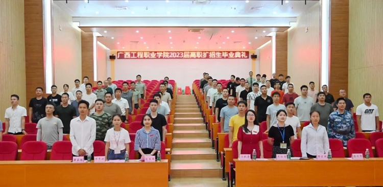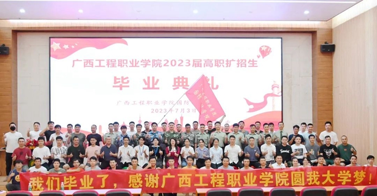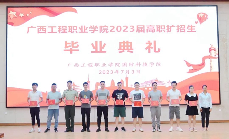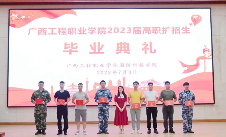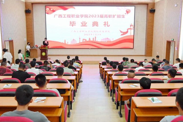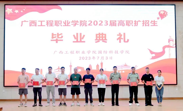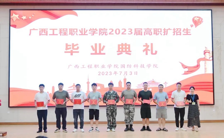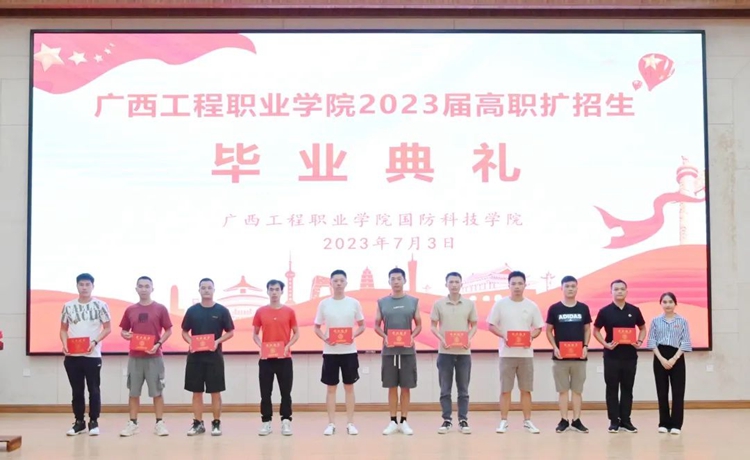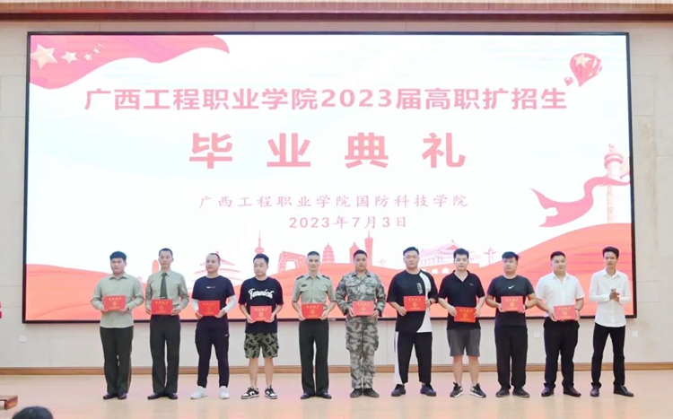 2023年7月3日上午,我校在圖文信息一樓學術報告廳舉行2023屆高職擴招生畢業(yè)典禮,學校黨委副書記黃秋霞、學生工作處科長范玉翠、學校團委副書記李麗清、國防科技學院全體教師、全體2023屆高職擴招畢業(yè)生參加了典禮。