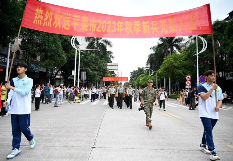 2023年9月14日上午,平果市人民政府舉行以“熱血披戎裝,啟程赴軍營”為主題的歡送新兵宣傳活動。我校組織師生代表參加了此次歡送宣傳活動,熱烈慶祝平果市熱血青年光榮入伍。在本次新兵隊伍中,我校的梁朝海、黃榮丹、李科、何利鋒、王政朗、蘇知佶、梁增康、吳武龍等八名學(xué)生攜筆從戎,光榮入伍。