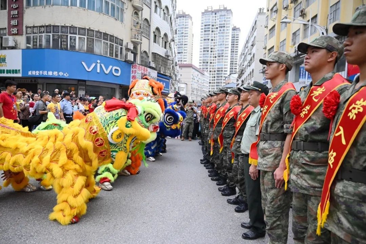 在儀仗隊的引領(lǐng)下,新兵們昂首挺胸,從行政大樓出發(fā),乘車沿著人民路、體育北路、龍景世家、火車站、第一小學(xué)、北街、東街、百貨大樓路線進(jìn)行游行,再徒步沿著中興百貨、烈士陵園、第九小學(xué)、婦幼保健院路線游行,沿線有舞獅隊、學(xué)生儀仗隊、鮮花隊、少數(shù)民族服裝隊、腰鼓隊同行,群眾駐足夾道歡送,并報以熱情歡呼聲。