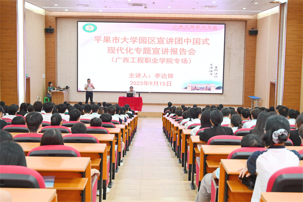 9月15日下午,平果市大學園園區(qū)宣講團中國式現(xiàn)代化專題報告會(工程學院專場)在我校圖文信息大樓一樓學術報告廳舉行,平果市大學園區(qū)宣講團成員、廣西幼兒師范高等??茖W校馬克思主義學院專任教師李達鐸受邀到我校進行宣講。全校思政課教師、各二級學院入黨積極分子、發(fā)展對象、學生黨員、班團干部等400多名師生代表參加宣講會。本次專題報告會由馬克思主義學院劉劍虹主任主持。