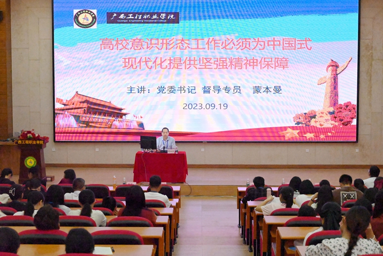 9月19日下午,在圖文信息大樓一樓學(xué)術(shù)報告廳,學(xué)校召開中國式現(xiàn)代化暨高校意識形態(tài)工作專題報告會,學(xué)校黨委書記、督導(dǎo)專員蒙本曼博士作《高校意識形態(tài)工作必須為中國式現(xiàn)代化提供堅強精神保障》專題報告。學(xué)校副校長蔣茂麗,學(xué)校黨組織書記、副書記,各部門負責(zé)人、行政人員,各專任教師和輔導(dǎo)員等400多人參加會議。會議由黨委辦副主任黃香琴主持。