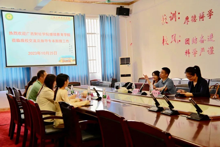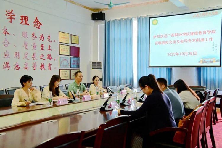 為更好的開展專本銜接合作項目,進(jìn)一步保障和提升人才培養(yǎng)質(zhì)量,10月25日,我校邀請廣西財經(jīng)學(xué)院繼續(xù)教育學(xué)院的領(lǐng)導(dǎo)、老師來校交流指導(dǎo)專本銜接工作。