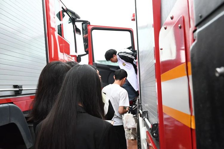 同學(xué)們登上消防救援車體驗(yàn)當(dāng)消防員的感受