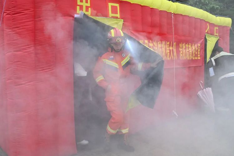 同學(xué)們?cè)谙绬T的帶領(lǐng)下,進(jìn)入模擬煙霧逃生體驗(yàn)帳篷區(qū),進(jìn)行消防逃生體驗(yàn)