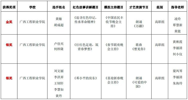 經(jīng)過(guò)綜合評(píng)比,大賽評(píng)出了金獎(jiǎng)、銀獎(jiǎng)、銅獎(jiǎng)、優(yōu)秀獎(jiǎng)和優(yōu)秀組織獎(jiǎng),并現(xiàn)場(chǎng)頒發(fā)了榮譽(yù)證書(shū)。廣西工程職業(yè)學(xué)院最終榮獲高職組金獎(jiǎng)一項(xiàng),銀獎(jiǎng)兩項(xiàng),并榮獲優(yōu)秀組織獎(jiǎng);廣西工程職業(yè)學(xué)院附屬中等職業(yè)學(xué)校榮獲高中/中職組銀獎(jiǎng)一項(xiàng)、銅獎(jiǎng)一項(xiàng);廣西工程職業(yè)學(xué)院平果附屬實(shí)驗(yàn)中學(xué)榮獲高中/中職組優(yōu)秀獎(jiǎng)一項(xiàng)。