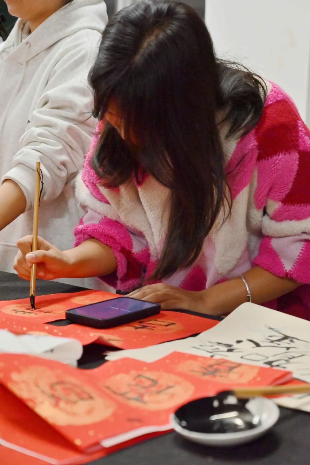 陣陣墨香指尖流,幽幽韻味心脾沁?;顒蝇F(xiàn)場,對聯(lián)紙、毛筆和硯臺被整齊地擺放在桌子上,鮮紅的紙張渲染著濃濃的節(jié)日氛圍。