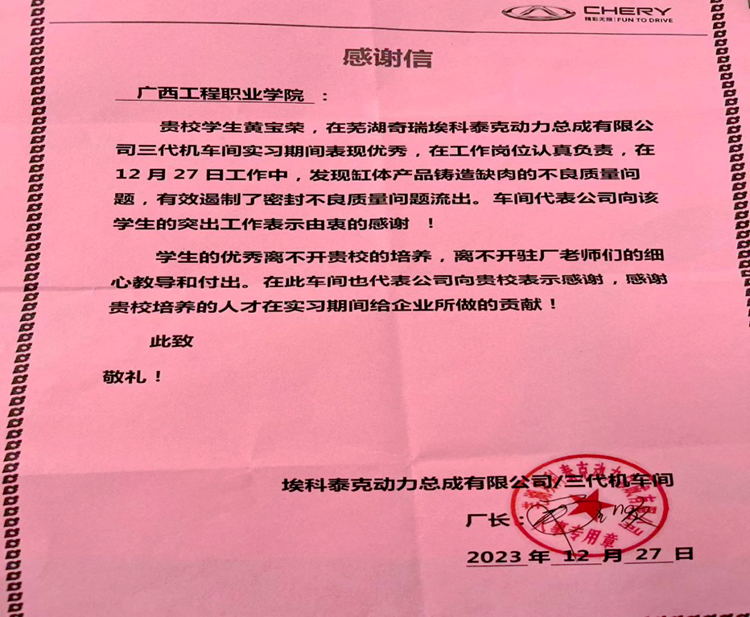 汽車與機(jī)電學(xué)院學(xué)子們扎實(shí)的專業(yè)技能和良好的職業(yè)素養(yǎng)得到了企業(yè)的一致認(rèn)可和高度評價(jià)。2023年12月27日,汽車與機(jī)電學(xué)院2021級汽車檢測與維修技術(shù)專業(yè)黃寶榮同學(xué),在工作中發(fā)現(xiàn)缸體產(chǎn)品鑄造缺肉的不良質(zhì)量問題,有效遏制了密封不良質(zhì)量問題流出。該企業(yè)對我校學(xué)生的突出工作表示由衷的感謝,為感謝學(xué)校對人才的辛勤培養(yǎng),特向?qū)W校寄來了感謝信。