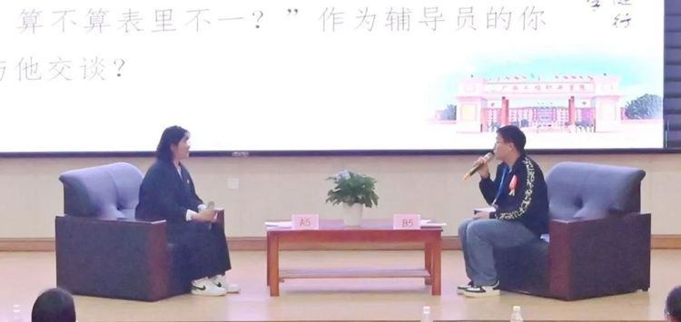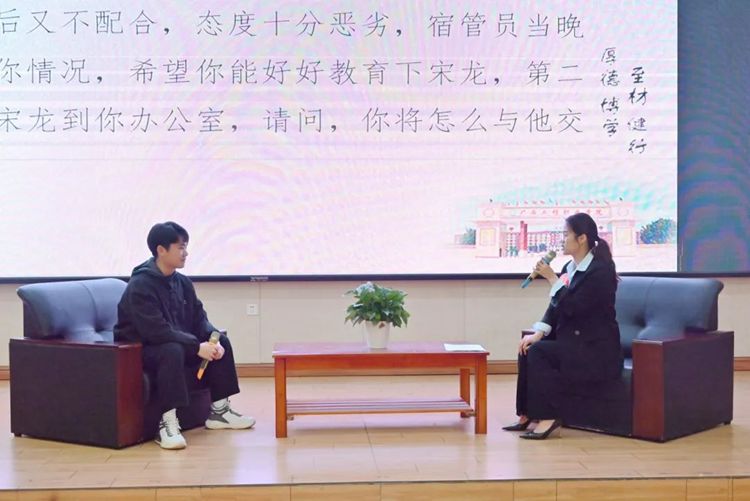 該環(huán)節(jié)綜合考察輔導(dǎo)員們運(yùn)用理論、案例研判及臨場解決問題的能力。選手們采用相互提問、回答的形式,從事件性質(zhì)、工作重點(diǎn)、管理難點(diǎn)等方面著手,層層抽絲剝繭,聚焦服務(wù)學(xué)生成長成才工作目標(biāo),引申出對(duì)思想引領(lǐng)、身心健康、成長支持、日常管理等各方面工作方法的深入討論與思考。