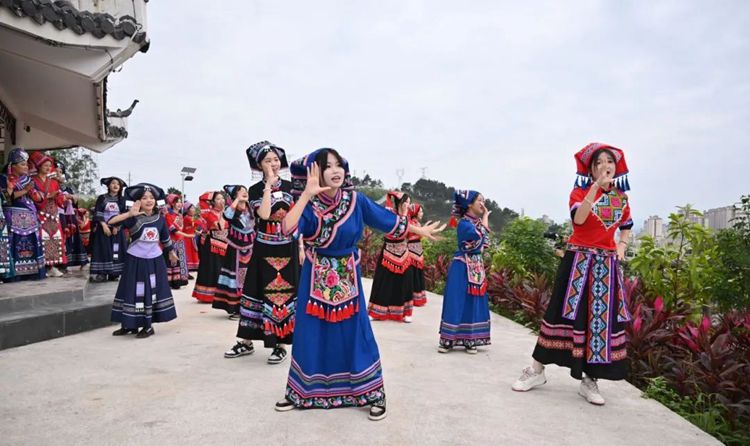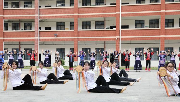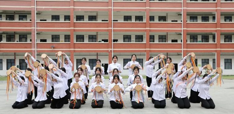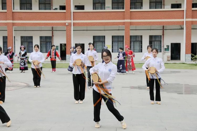 在學(xué)校教學(xué)區(qū)小廣場,蓮鼓越歌行的舞者們手持鼓棒和蓮花,配合鼓聲和歌曲的旋律,跳躍著獨特的舞步,展示出優(yōu)美、熱烈、充滿活力的舞蹈文化。