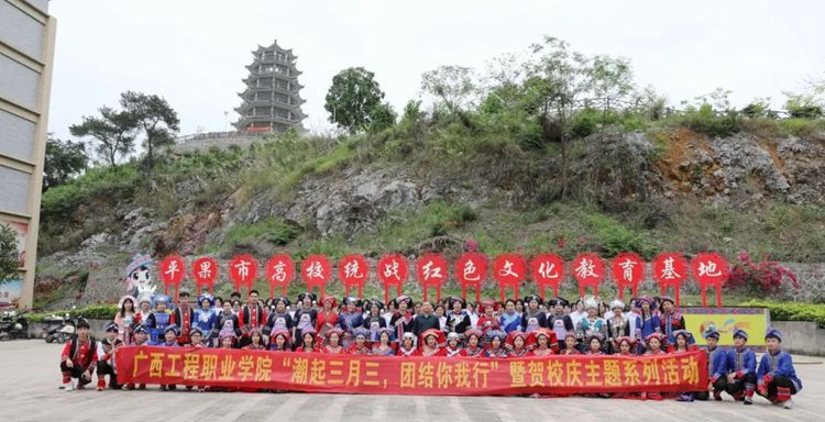 4月9日,學(xué)校師生身穿民族服飾,相聚工程塔,唱山歌,拋繡球,感受多彩民族風(fēng)情,同慶“廣西三月三”民族傳統(tǒng)節(jié)日。黨委書記、督導(dǎo)專員蒙本曼等校領(lǐng)導(dǎo)參加了活動。