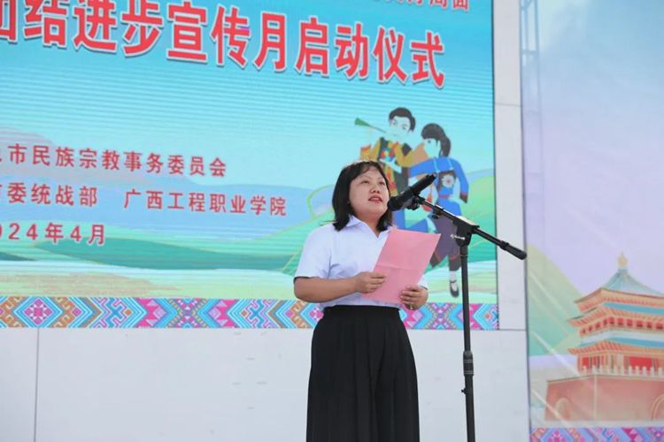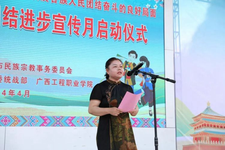 黨委副書記、校長羅艷妮在致辭中向出席啟動儀式的各位領(lǐng)導(dǎo)和嘉賓表示歡迎,向關(guān)心支持廣西工程職業(yè)學(xué)院民族團(tuán)結(jié)進(jìn)步事業(yè)的各級領(lǐng)導(dǎo)、各界人士和積極投身民族團(tuán)結(jié)進(jìn)步事業(yè)創(chuàng)建的廣大干部群眾、師生員工表示感謝。