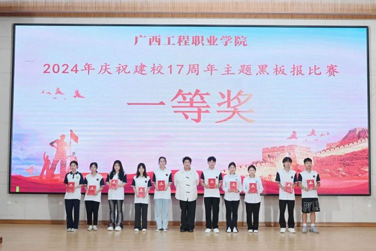 藝術(shù)設(shè)計學(xué)院黨支部副書記趙志輝為獲得2024年慶祝建校17周年主題黑板報比賽一等獎的代表頒獎