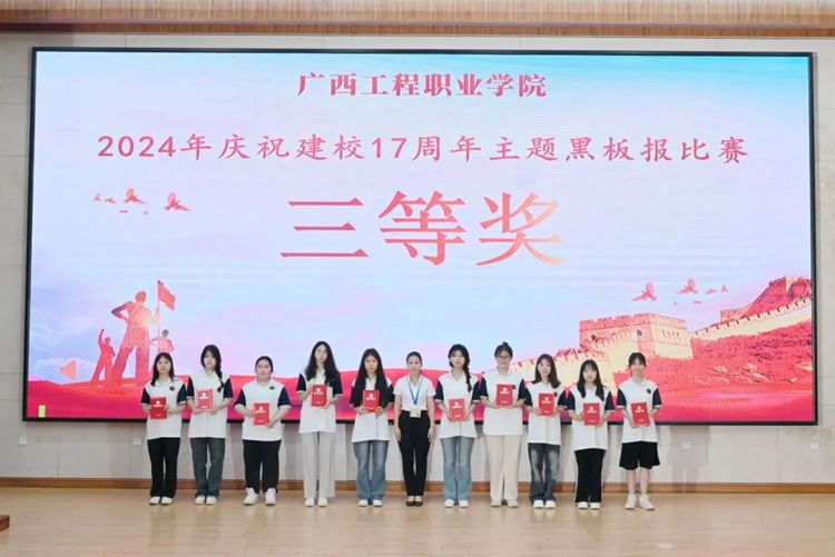 國防科技學(xué)院辦公室主任黃秀妮為獲得2024年慶祝建校17周年主題黑板報比賽三等獎的代表頒獎