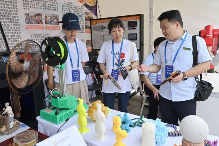 展區(qū)現(xiàn)場,教學督導室主任韋永驍副教授、汽車與機電學院副院長梁欣欣及土木工程學院潘新康、藝術與設計學院郁長松、汽車與機電學院韋遠安等教師為觀眾詳細介紹學校的特色展示項目,觀眾深受吸引,忍不住親身體驗。