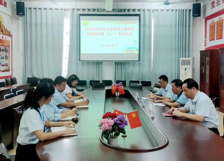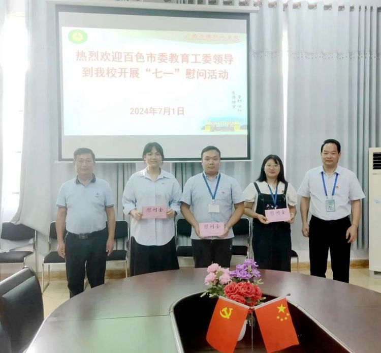 2024年7月1日,是中國共產(chǎn)黨成立103周年紀(jì)念日。為加強(qiáng)黨內(nèi)關(guān)懷,傳遞組織溫暖,進(jìn)一步弘揚(yáng)黨的光榮傳統(tǒng)和優(yōu)良作風(fēng),7月1日下午,百色市委教育工委委員、市教育局黨組成員、總督學(xué)梁富文和市教育督導(dǎo)中心副主任王小東到我校開展“七一”慰問困難黨員活動,帶來黨和政府的組織關(guān)懷和節(jié)日問候。學(xué)校黨委書記、督導(dǎo)專員蒙本曼陪同慰問。
