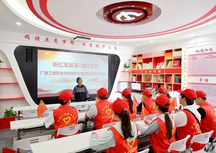 在百谷紅軍村,百谷紅軍村革命后代家屬帶領(lǐng)全體實踐團、服務(wù)團成員參觀了百谷紅軍村陳列室,她講解了百谷紅軍紅色革命故事。1929年12月,鄧小平、張云逸等無產(chǎn)階級革命家領(lǐng)導(dǎo)和發(fā)動了百色起義,建立紅七軍和右江蘇維埃政權(quán),創(chuàng)建右江革命根據(jù)地。百谷村131人參加革命,其中50多人參加紅七軍和農(nóng)民協(xié)會,為鞏固和發(fā)展右江革命根據(jù)地的建設(shè)作出了積極貢獻。她將百谷村的歷史及百谷村發(fā)展現(xiàn)狀等向?qū)嵺`團、服務(wù)團成員進行了講解,并深入交流了鄉(xiāng)村的文化建設(shè)。此外,百谷紅軍村革命后代家屬還帶領(lǐng)了全體師生黨員齊唱了《紅軍紅又紅》《工農(nóng)革命要團結(jié)》《誰是革命主力軍》《共產(chǎn)黨領(lǐng)導(dǎo)真正確》等紅歌。