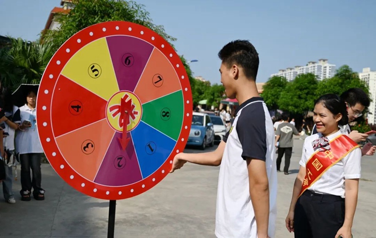 揭牌儀式后,現場開展反詐知識宣傳和舉行“反詐大轉盤”“玩套圈、防圈套”“反詐知多少”“反詐主題版”等反詐小游戲,參與游戲的師生每人領取一張集印章反詐宣傳小卡片,每完成一項游戲可集一個印章,集滿印章即可用小卡換取一份禮品?;顒影逊丛p知識與互動游戲相結合起來,吸引眾多師生參與。