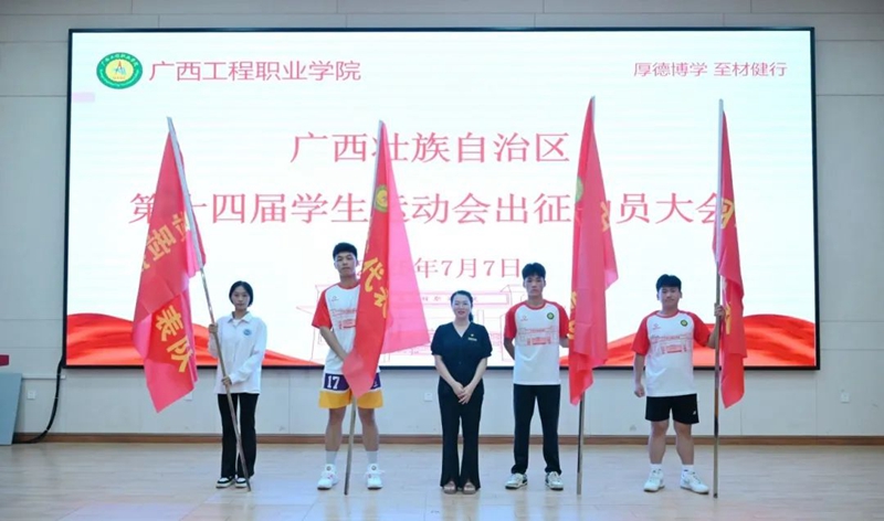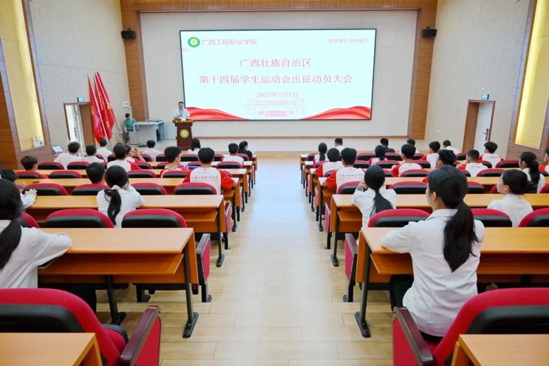 2025年7月7日,廣西壯族自治區(qū)第十四屆學(xué)生運動會廣西工程職業(yè)學(xué)院代表團(tuán)出征動員大會在圖文信息大樓五樓學(xué)術(shù)報告廳舉行。大會旨在為即將出征的運動員們鼓舞士氣、凝聚力量。