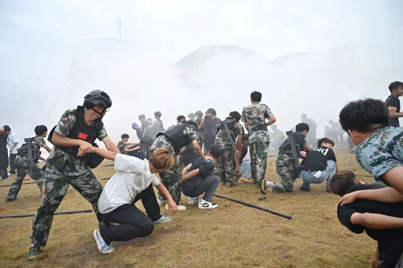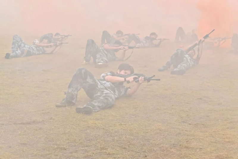 戰(zhàn)士們身著防毒面具,手持仿真槍?zhuān)?ldquo;硝煙”彌漫的場(chǎng)景中細(xì)致進(jìn)行隱蔽偵查。他們默契配合,時(shí)而沖鋒突擊向前,時(shí)而格擋防御來(lái)襲,時(shí)而果斷實(shí)施抱摔,成功深入“敵區(qū)”并解救“人質(zhì)”。緊密的戰(zhàn)術(shù)銜接、精準(zhǔn)的指揮調(diào)度,再加上對(duì)“敵人”攻擊的巧妙躲避,將一場(chǎng)模擬實(shí)戰(zhàn)的緊張與高效展現(xiàn)得淋漓盡致。