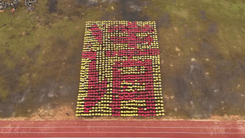 登高俯瞰,那些用卡紙擺成的字逐漸清晰映入眼簾。每一道筆畫(huà)都浸透著同學(xué)們的努力與汗水,每一個(gè)成形的字都像在訴說(shuō)著他們的執(zhí)著信念,也散發(fā)著鼓舞人心的力量。