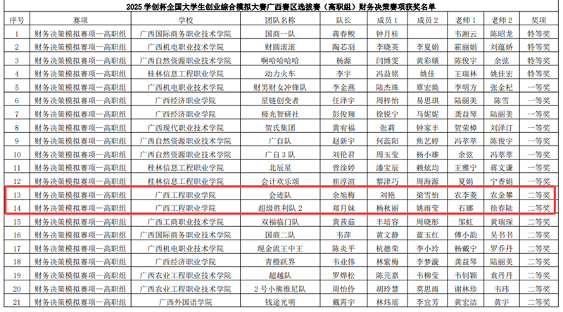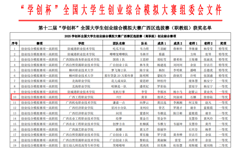 6月27日—28日,2025年第十二屆“學(xué)創(chuàng)杯”全國大學(xué)生創(chuàng)業(yè)綜合模擬大賽廣西賽區(qū)選拔賽(職教組)在柳州職業(yè)技術(shù)大學(xué)舉行。本次選拔賽共有32所高校、500余師生參與競賽。我校經(jīng)濟管理學(xué)院石娜和徐春陸,鐵道與航空學(xué)院徐琳和韋丹蕾共4位老師帶領(lǐng)2023級大數(shù)據(jù)與會計專業(yè)黃菲、2023級電子商務(wù)專業(yè)鄭誠、2023級城市軌道交通工程技術(shù)專業(yè)方益元、2023級學(xué)前教育專業(yè)許婉婷等26名同學(xué)參加此次比賽,通過不懈努力,我校學(xué)子榮獲