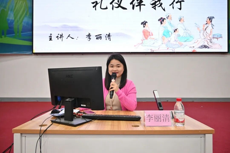 圖為團委副書記李麗清作《文明禮儀伴我行》專題教育