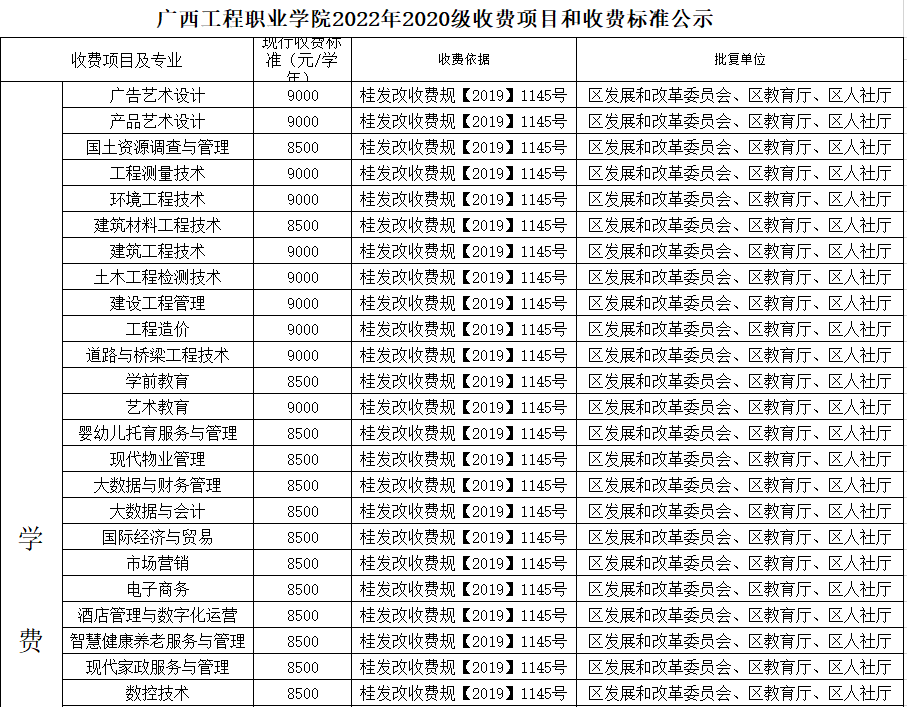 廣西工程職業(yè)學(xué)院2022年2020級(jí)收費(fèi)項(xiàng)目和收費(fèi)標(biāo)準(zhǔn)公示