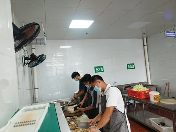 圖為教師到食堂幫忙準(zhǔn)備佳肴