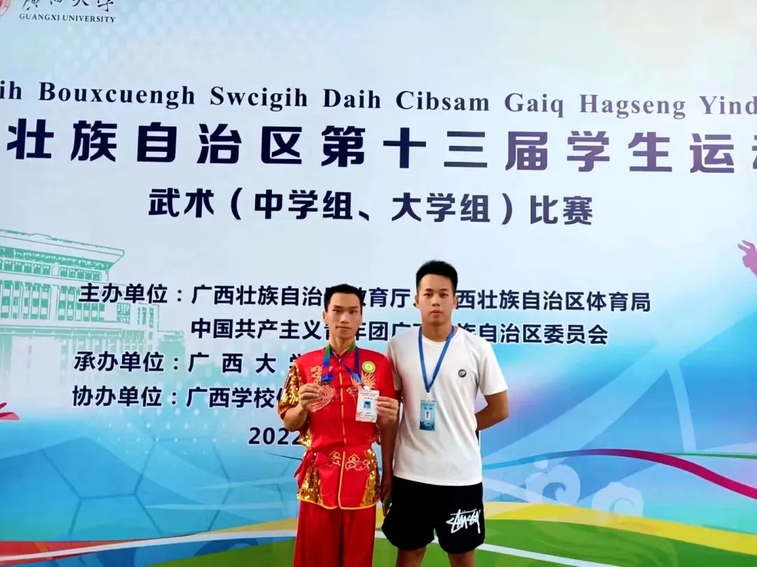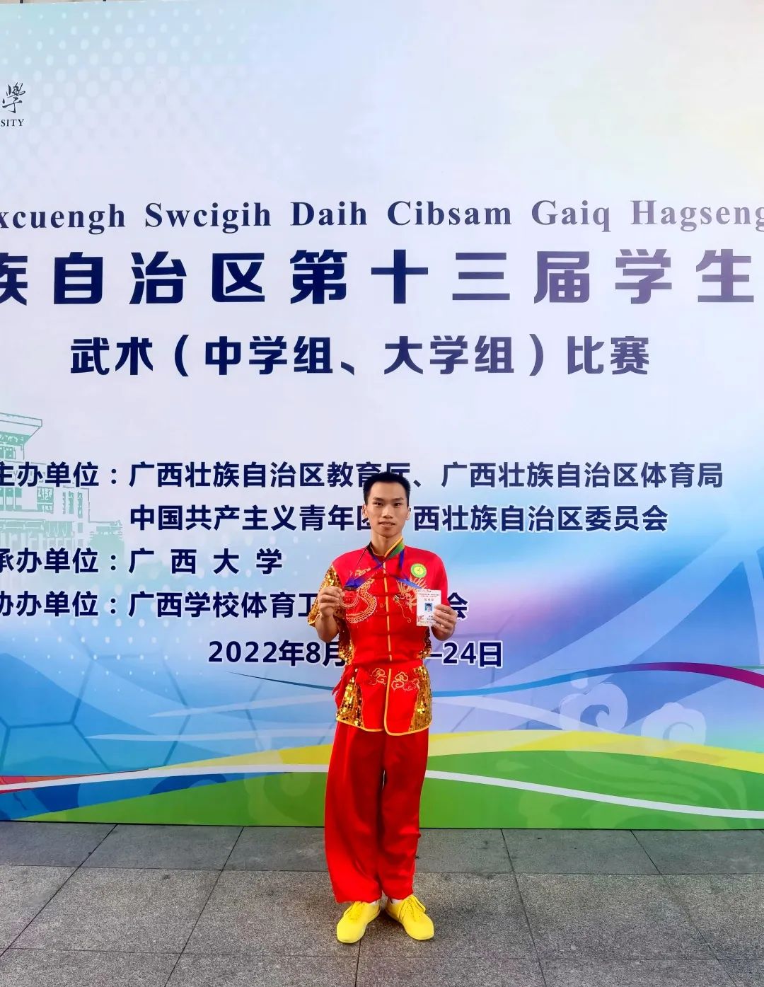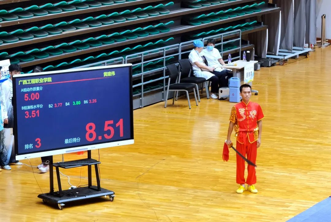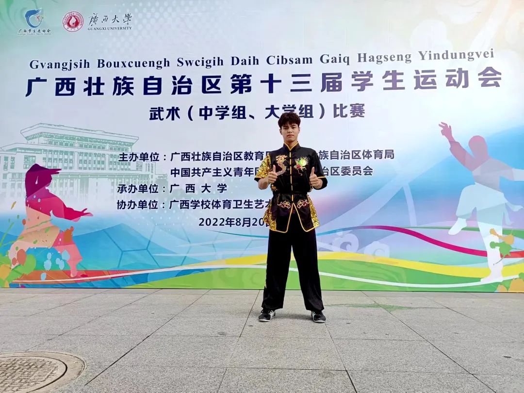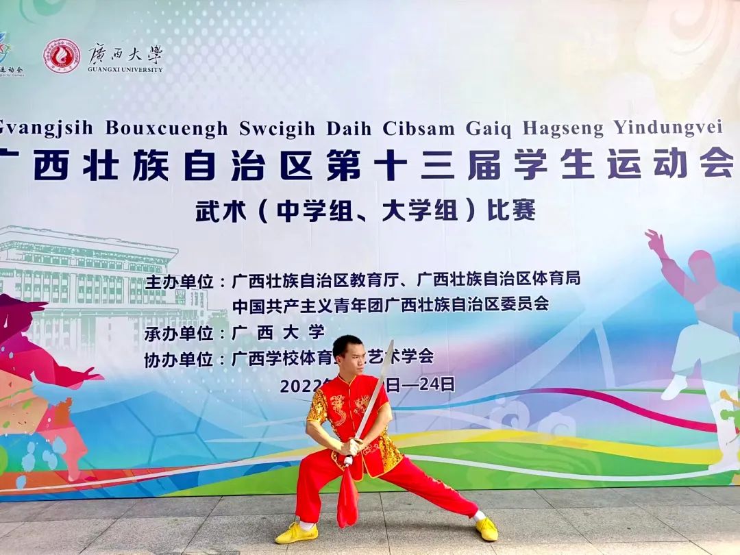 8月22日至24日,廣西壯族自治區(qū)第十三屆學(xué)生運動會武術(shù)(中學(xué)組、大學(xué)組)比賽在廣西大學(xué)舉行,廣西工程職業(yè)學(xué)院武術(shù)代表隊4名運動員在教練員何云峰老師的帶領(lǐng)下參加本次比賽。經(jīng)過3天緊張激烈的角逐,最終來自經(jīng)濟(jì)管理學(xué)院20級電子商務(wù)1班的黃建偉同學(xué)獲得高職高專組刀術(shù)第三名、20級電子商務(wù)1班陳基杜同學(xué)榮獲高職高專組三路長拳第八名。