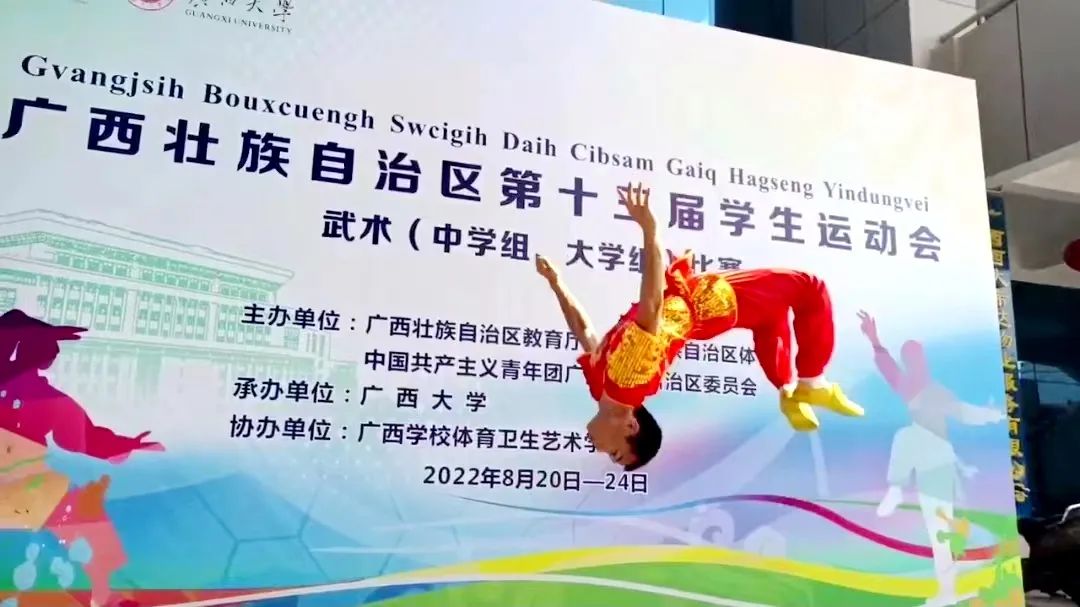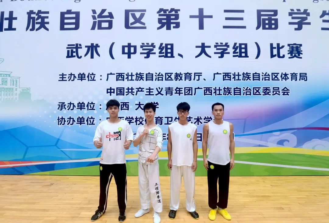 征戰(zhàn)廣西壯族自治區(qū)第十三屆學(xué)生運動會武術(shù)(中學(xué)組、大學(xué)組)比賽的4名隊員:
