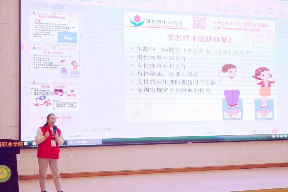 百色市中心血站韋麗丹老師通過PPT圖文并茂地給大家介紹了血液常識、獻血前后注意事項、獻血流程、相關法律法規(guī)等。講座中她還對無償獻血認識中存在的誤區(qū)及學生關注的問題進行了具體闡述與分析,讓同學們對無償獻血有了更深刻的認識。