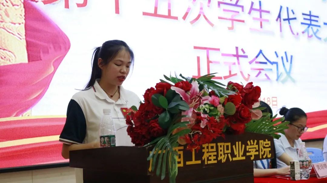 第一次會(huì)議結(jié)束后,第二次全體會(huì)議隨即召開。學(xué)生代表表決通過了關(guān)于《廣西工程職業(yè)學(xué)院第十五屆學(xué)生會(huì)工作報(bào)告》的決議,當(dāng)選學(xué)生會(huì)主席團(tuán)成員的黃詩琦同學(xué)宣讀倡議書,學(xué)校黨委副書記黃秋霞作總結(jié)講話。