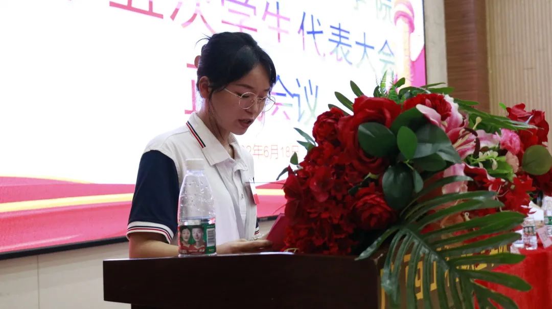 第十五屆學(xué)生會(huì)辦公室副主任覃依玲宣讀廣西工程職業(yè)學(xué)院第十五次學(xué)生代表大會(huì)總監(jiān)票人、監(jiān)票人、總計(jì)票人、計(jì)票人名單(草案)》