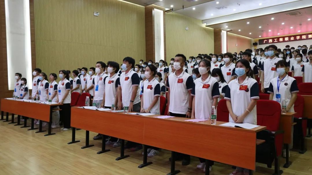 在慷慨激昂的國歌聲中,廣西工程職業(yè)學(xué)院第十五次學(xué)生代表大會(huì)第一次正式會(huì)議拉開了帷幕。黨委副書記黃秋霞,汽車與機(jī)電學(xué)院副院長(zhǎng)梁欣欣、思政課教學(xué)部副主任吳發(fā)德、校團(tuán)委書記梁鳳琴、土木工程學(xué)院分團(tuán)委書記陳春任、經(jīng)濟(jì)管理學(xué)院分團(tuán)委書記李東英、汽車與機(jī)電學(xué)院分團(tuán)委書記楊小櫻、鐵道與航空學(xué)院分團(tuán)委書記謝小玲、藝術(shù)設(shè)計(jì)學(xué)院分團(tuán)委書記龍金妹、教育學(xué)院分團(tuán)委副書記黃小寶、校團(tuán)委老師黃詩晴出席會(huì)議。校學(xué)生會(huì)全體學(xué)生干部、社團(tuán)代表、各二級(jí)學(xué)院學(xué)生代表參加本次大會(huì)。