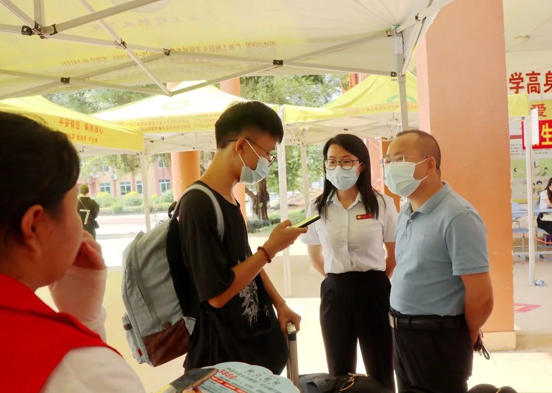 為確保新生入學(xué)平穩(wěn)有序進(jìn)行,校黨政領(lǐng)導(dǎo)親臨報(bào)到現(xiàn)場,走訪校內(nèi)各迎新服務(wù)點(diǎn)、學(xué)生宿舍、食堂等場所檢查工作,并與新生親切交流,看望、慰問迎新工作人員和志愿者們。