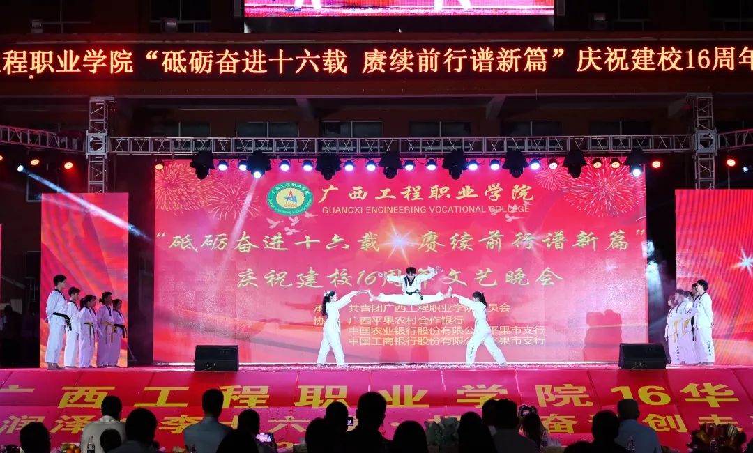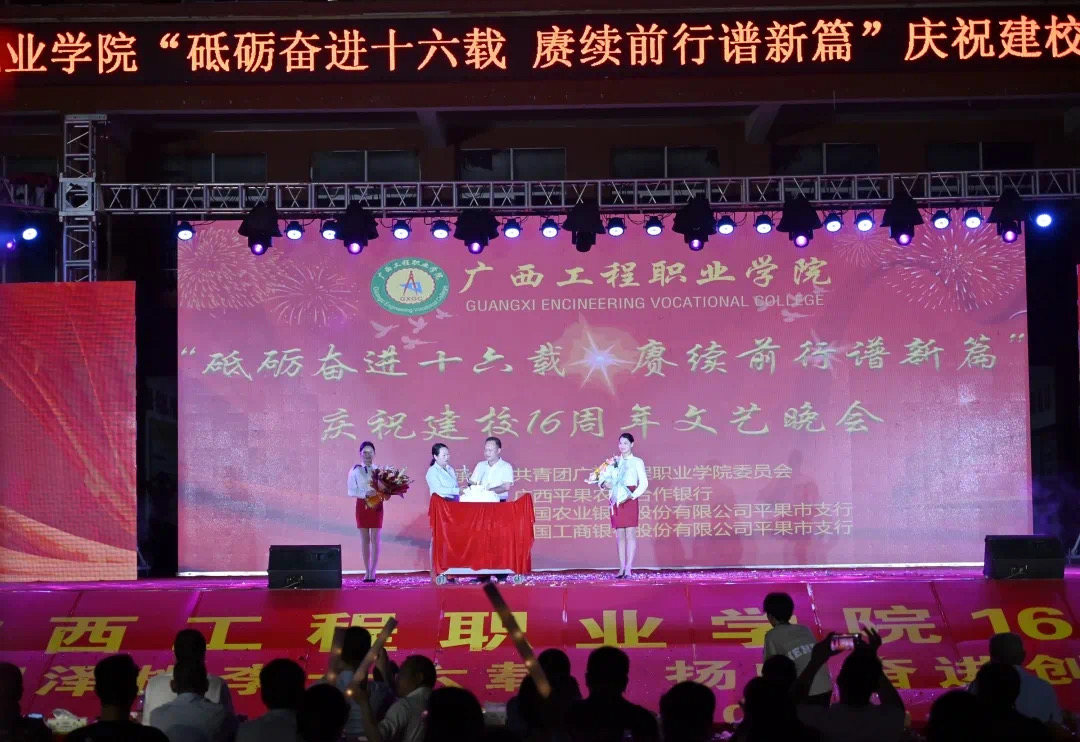 學(xué)校董事長(zhǎng)李益宣布廣西工程職業(yè)學(xué)院慶祝建校16周年文藝晚會(huì)開始!禮炮響起,煙火綻放,校園的夜空璀璨,校園里其樂融融,共同慶祝學(xué)校16歲生日,祝愿廣西工程職業(yè)學(xué)院的未來更加輝煌!