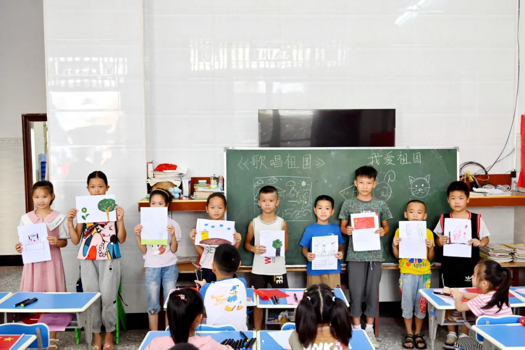 實(shí)踐團(tuán)、服務(wù)團(tuán)成員們耐心教小朋友們唱歌、畫畫、朗誦,現(xiàn)場(chǎng)洋溢著學(xué)習(xí)的歡樂和濃厚的愛國(guó)情感