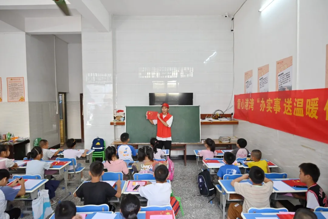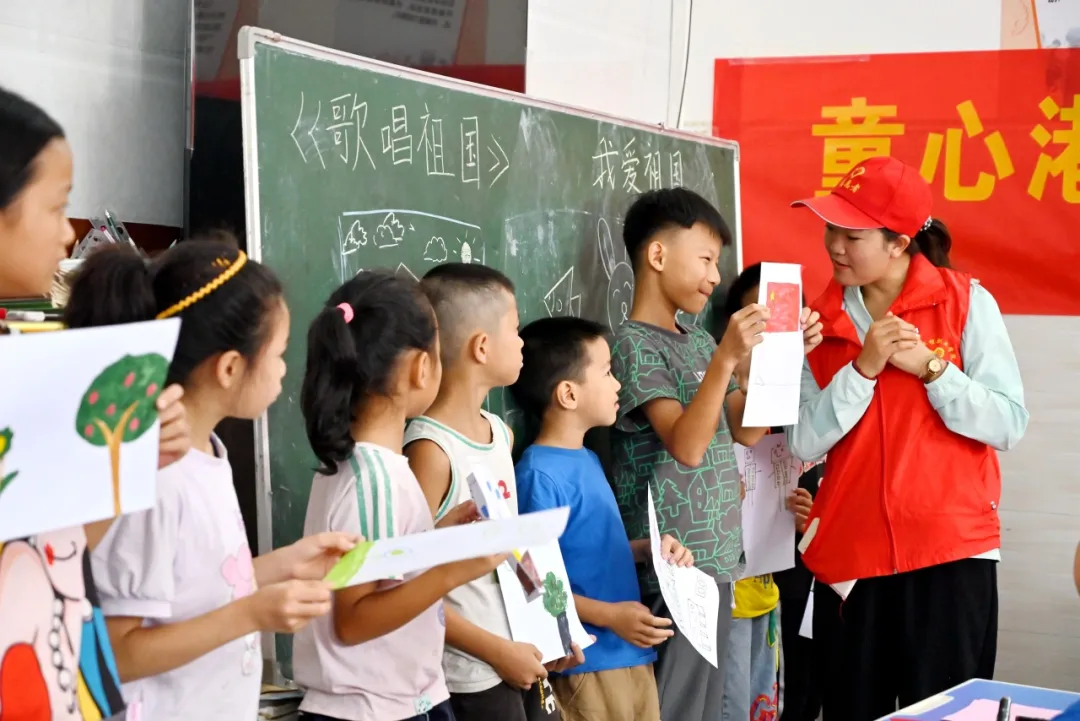 實(shí)踐團(tuán)、服務(wù)團(tuán)成員開展了“童心港灣‘辦實(shí)事 送溫暖 傳真情’”主題活動(dòng)。活動(dòng)中,志愿者們教小孩子唱歌、朗誦、畫畫,以《歌唱祖國(guó)》《我愛祖國(guó)》等為主題,慶祝今年新中國(guó)成立75周年,增強(qiáng)孩子們的愛國(guó)意識(shí);同時(shí)還給孩子們送上五顏六色的文具、水杯、雨傘、糖果、筆記本等愛心紀(jì)念品,整個(gè)活動(dòng)充滿歡聲笑語。