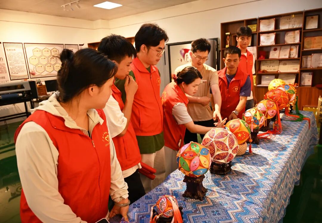 現(xiàn)場工作人員向實踐團介紹繡球的制作過程