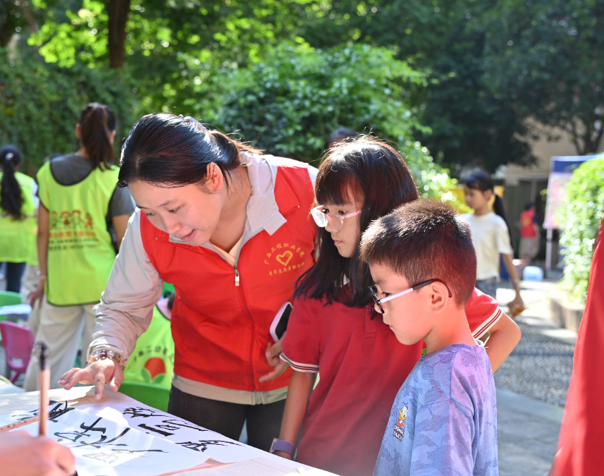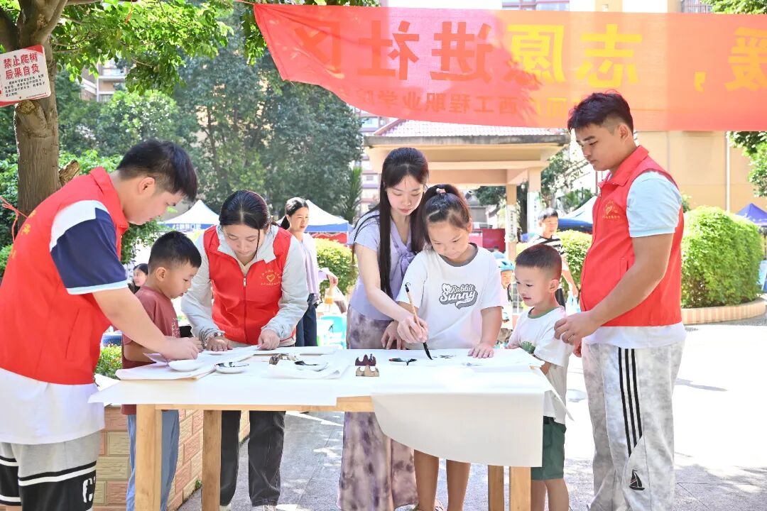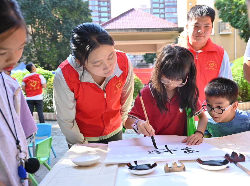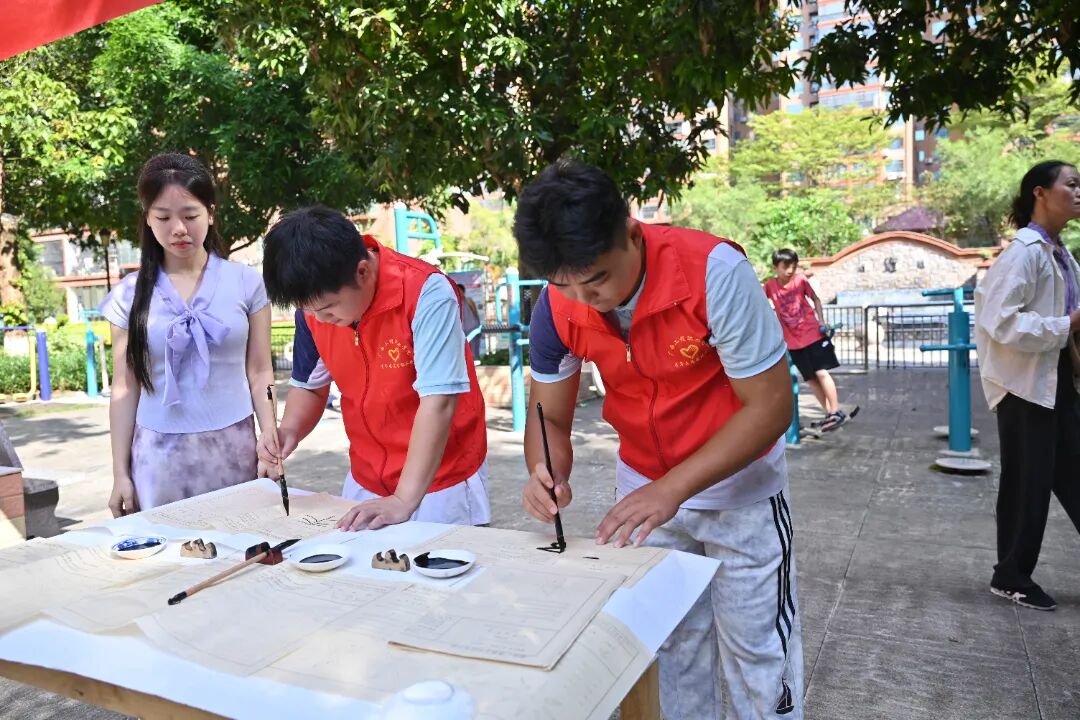 書法傳情活動現(xiàn)場,志愿者們耐心指導社區(qū)居民揮毫潑墨,孩子們在旁認真觀摩學習,墨香與書香交織,傳統(tǒng)文化在互動中傳承,志愿溫情浸潤人心。