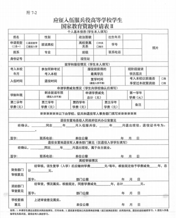 學生登錄全國征兵網(wǎng)注冊報名,完成填寫后從系統(tǒng)下載打印《應征入伍服兵役高等學校學生國家教育資助申請表Ⅱ》(附件2),將此表分別拿到學校財務處、入伍地方縣級武裝部蓋章,貼好個人1寸照片(底色不限),最后提交材料包括此表蓋好章的原件2份和《退役證書》復印件2份。申請學生通過全國征兵網(wǎng)在線填寫、打印此表(手填或復印無效)。