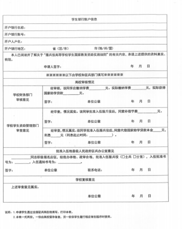 3.兩種學費資助申請表均需要學生本人用賬戶密碼登錄全國征兵網(wǎng)進行填寫,完成填寫后才能從系統(tǒng)上下載并打印。從其他網(wǎng)站或其他渠道找到表格模板來填寫并打印的無效。