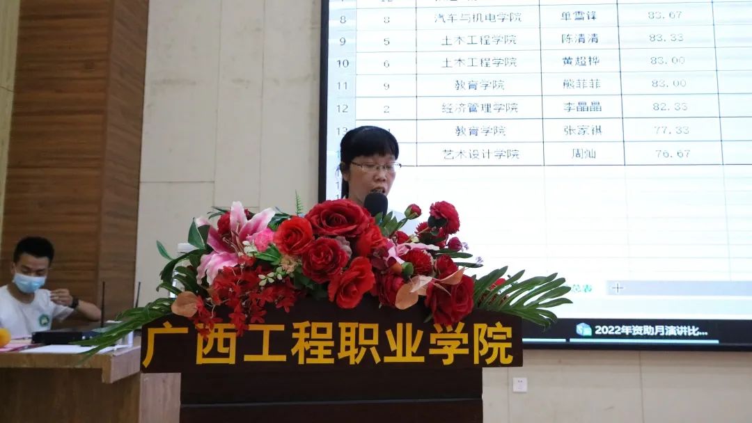學(xué)校黨委副書(shū)記黃秋霞,黨委委員、經(jīng)濟(jì)管理學(xué)院院長(zhǎng)龐英連,黨委委員、學(xué)生工作處副處長(zhǎng)李麗詩(shī),鐵道與航空學(xué)院院長(zhǎng)覃鳳姣,黨委辦公室副主任黃香琴,校團(tuán)委書(shū)記梁鳳琴出席比賽。各二級(jí)學(xué)院科長(zhǎng)、輔導(dǎo)員、師生代表到場(chǎng)觀看比賽。