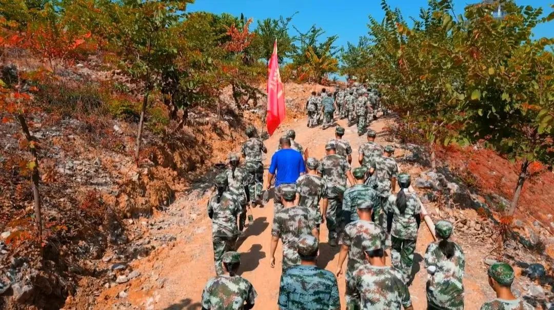 汗水打濕了軍裝,同學(xué)們?nèi)匀换ハ喙膭?lì)