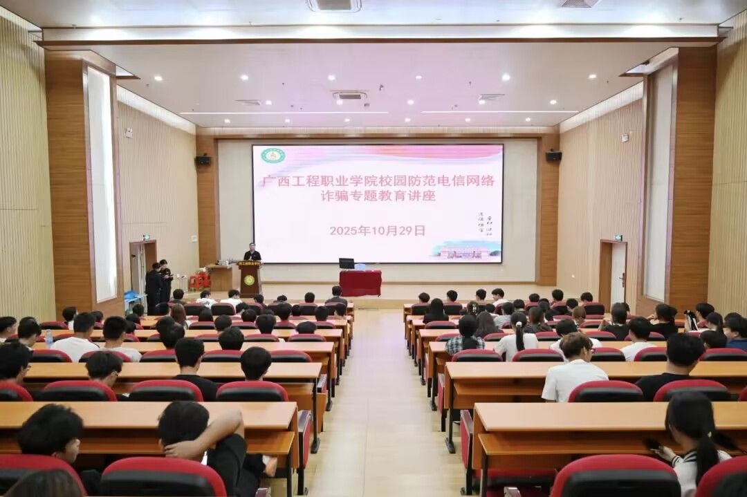 為提升我校2025級新生防詐騙意識,構筑防范電信詐騙校園防線。2025年10月29日,我校邀請平果市公安局反詐專班李桐警官進行《防范電信詐騙,共建平安平果》專題講座。