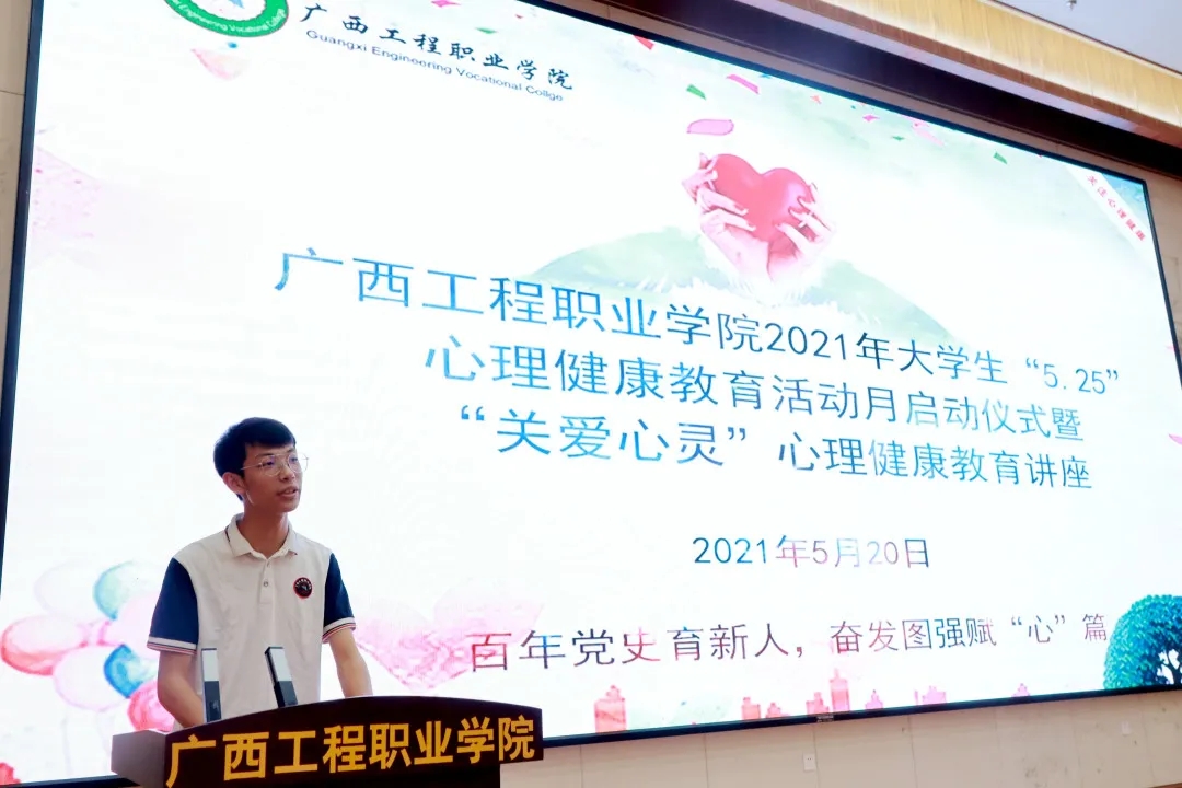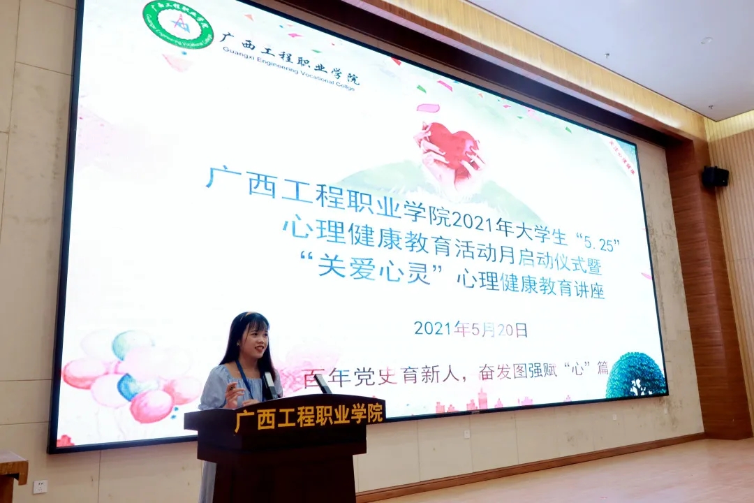 為進(jìn)一步提高學(xué)生的心理健康水平,培育學(xué)生熱愛(ài)生命、自強(qiáng)不息、積極向上的健康心態(tài),加強(qiáng)人文關(guān)懷和心理疏導(dǎo),開(kāi)展我校學(xué)生心理健康教育活動(dòng),促進(jìn)學(xué)生心理健康素質(zhì)與愛(ài)黨愛(ài)國(guó)思想道德素質(zhì)、科學(xué)文化素質(zhì)協(xié)調(diào)發(fā)展。2021年5月20日下午,我校學(xué)生工作處在圖文信息大樓一樓學(xué)術(shù)報(bào)告廳組織開(kāi)展2021年我校大學(xué)生“5·25”心理健康教育活動(dòng)月啟動(dòng)儀式暨“關(guān)愛(ài)心靈”心理健康教育講座。