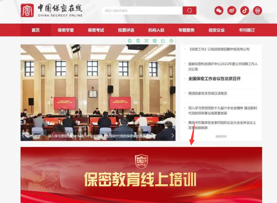 (2)通過中國保密在線網(wǎng)站進入培訓系統(tǒng):點擊首頁標題圖進入即可。
